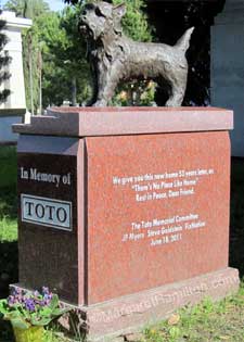 This cemetary is loaded with stars (former stars?), and Toto's monument was placed right outside the imposing Cathedral Mausoleum, only a stone's throw from Hattie McDaniel's placard/monument (you remember Mammy in Gone With the Wind, right?), dashing Tyrone Power, and lots of duck and goose crap, thanks to a rather "fowl" nearby pond. I kid you not: If you go there, bring an old pair of shoes or boots and a scraper because there isn't a clean spot anywhere on the lawns around these gravesites. And by the way: Hattie McDaniel isn't really buried there: She wanted to be there, but there was a "whites only" policy back then; McDaniel's survivors declined the offer to have her remains relocated to HFC...can't say that I blame them.
