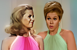 Back in the '60s, costumes and gowns were often recycled from one show to the next. Such was the case with Montgomery's gown in this clip. This particular gown was first used in Bewitched episode 73 (2 June 1966); it was also used in three later episodes. So why does the composite photo on the left show the dress as green? That show was filmed in black-and-white; when it was colorized for DVD decades later, the computer colored it green.The audio track for this clip has been enhanced with simulated stereo. It is most noticeable when the choir starts singing the lyrics. I'm not sure if Montgomery enjoyed doing this show...her facial unhappiness near the end of the clip--which too quickly turned into a smile--has always been annoying.
