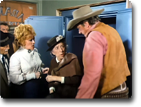 Most of this clip is the footage used in the broadcast; it's at the end where Edsel Pry's outtake occurs. Maggie guest-starred on this popular Western-themed show, and was pretty much in character playing the role of fussbudget again. This time, she gets locked in a new safe, where she sits for quite some time before Matt is able to get the combination to open the thing. Miss Pry was none too happy about it.